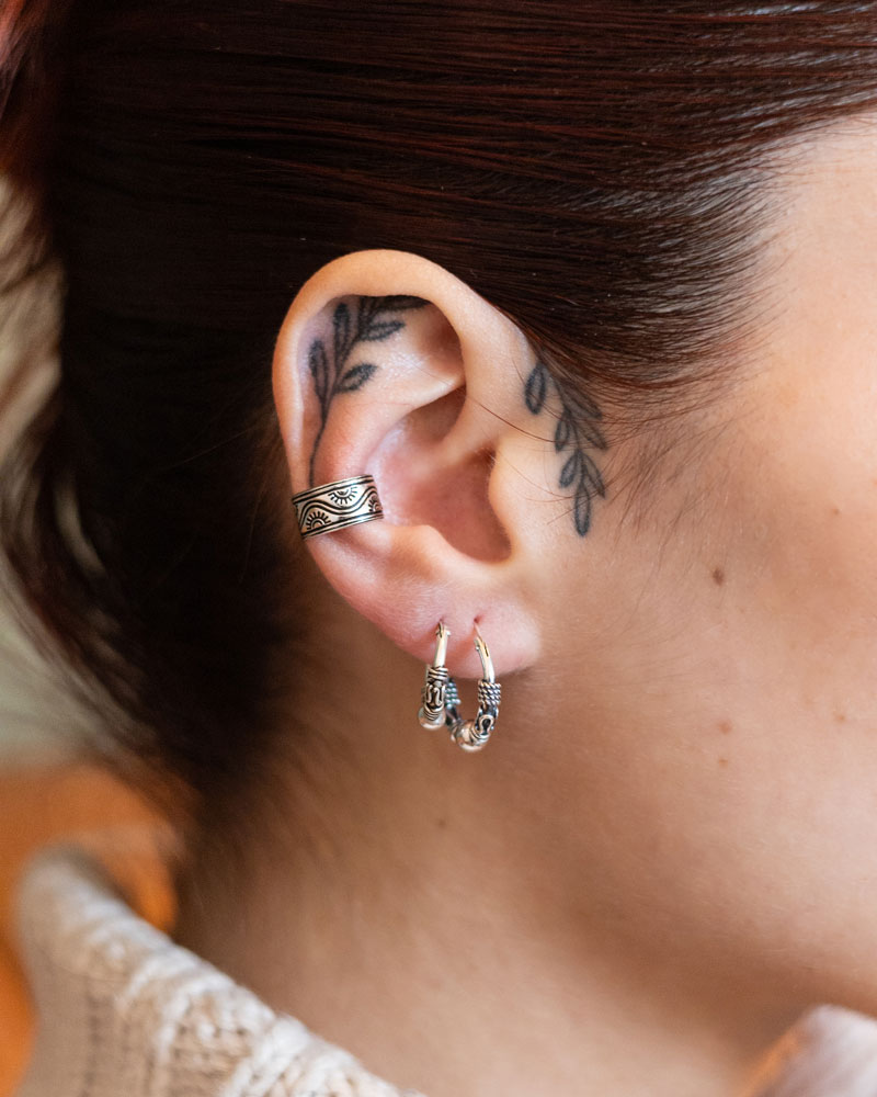 – Sur la 2ᵉ image : la créole Morad est portée au deuxième trou, associée à la créole Ysoria et au ear cuff Grannus.