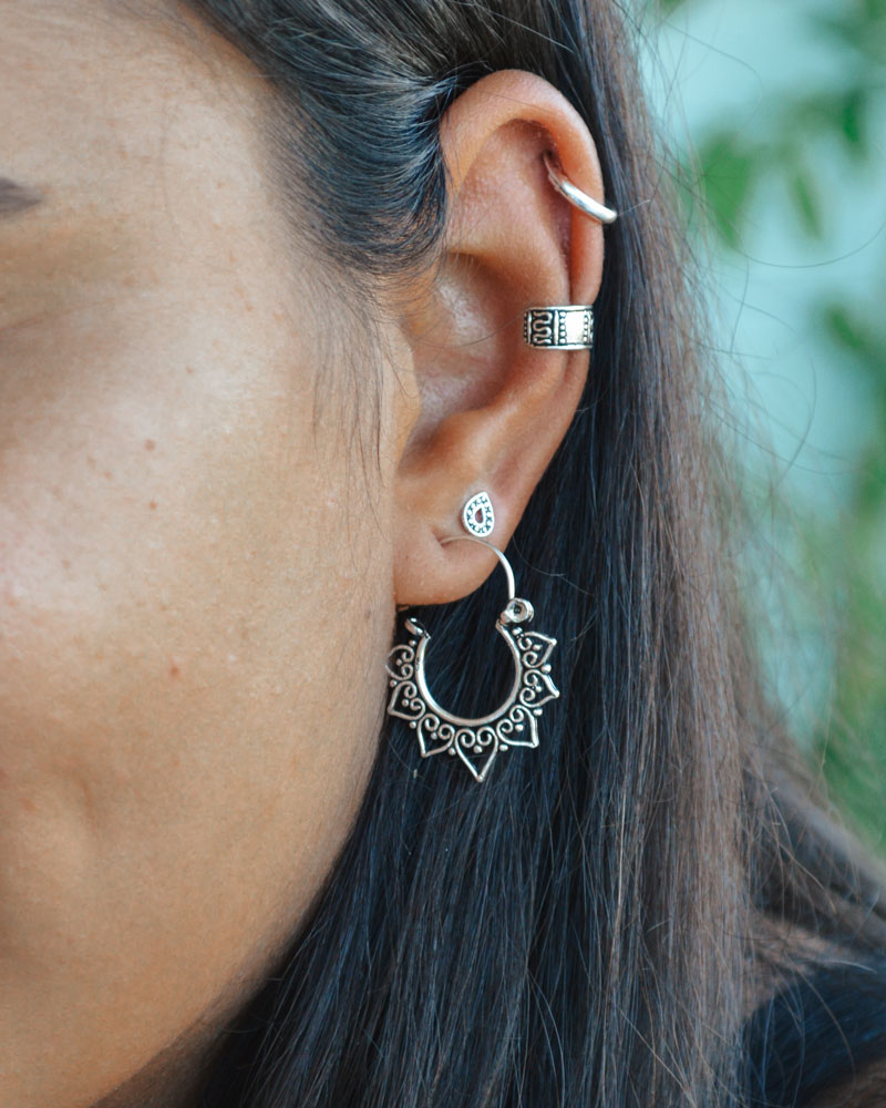 – Na 2ª imagem: este modelo está a ser usado no lóbulo em conjunto com os Brincos Alana (2º furo), o Ear Cuff Chad e as Argolas Pandra (12mm).