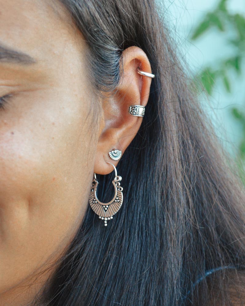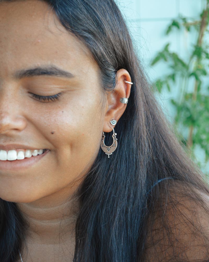 – Na 2ª imagem: este modelo está a ser usado no lóbulo em conjunto com os Brincos Epona, o Ear Cuff Chad e as Argolas Pandra (10mm).