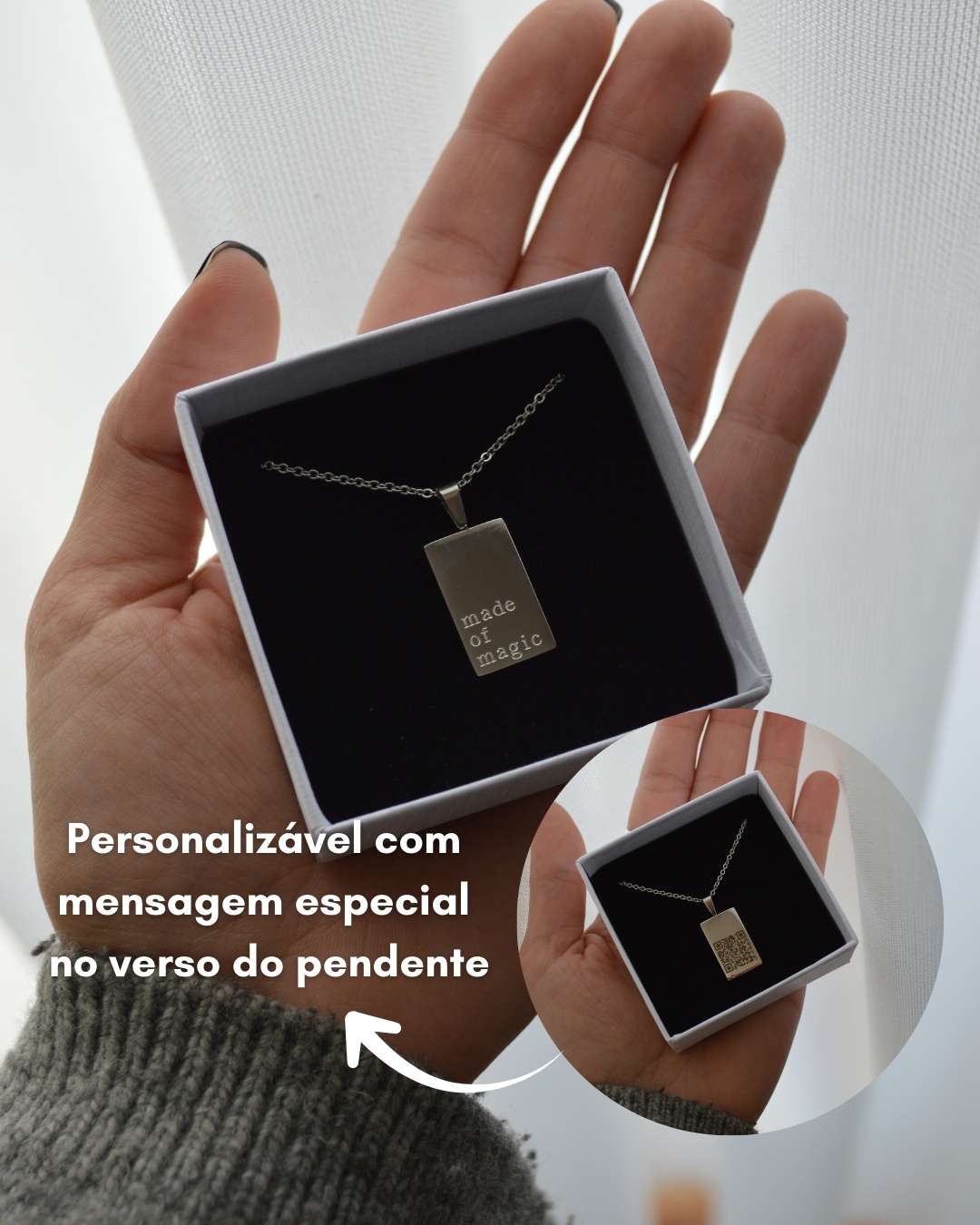 | Tipo de Colar | Com personalização: com QR Code, Sem personalização: sem QR Code |