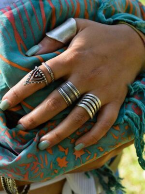 – Na 4ª imagem: o anel no dedo médio, combinado com o Anel Armelle.